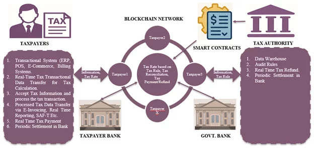 Tax authorities can publish tax rules and rates in the blockchain network using smart contracts. Any transaction initiated by the taxpayer will be validated against these contracts for tax rates. The process can be further enhanced by integrating cryptocurrency into tax systems. In fact, the blockchain was originally designed to transfer digital currencies without the involvement of central banks. The same mechanism can be applied here.