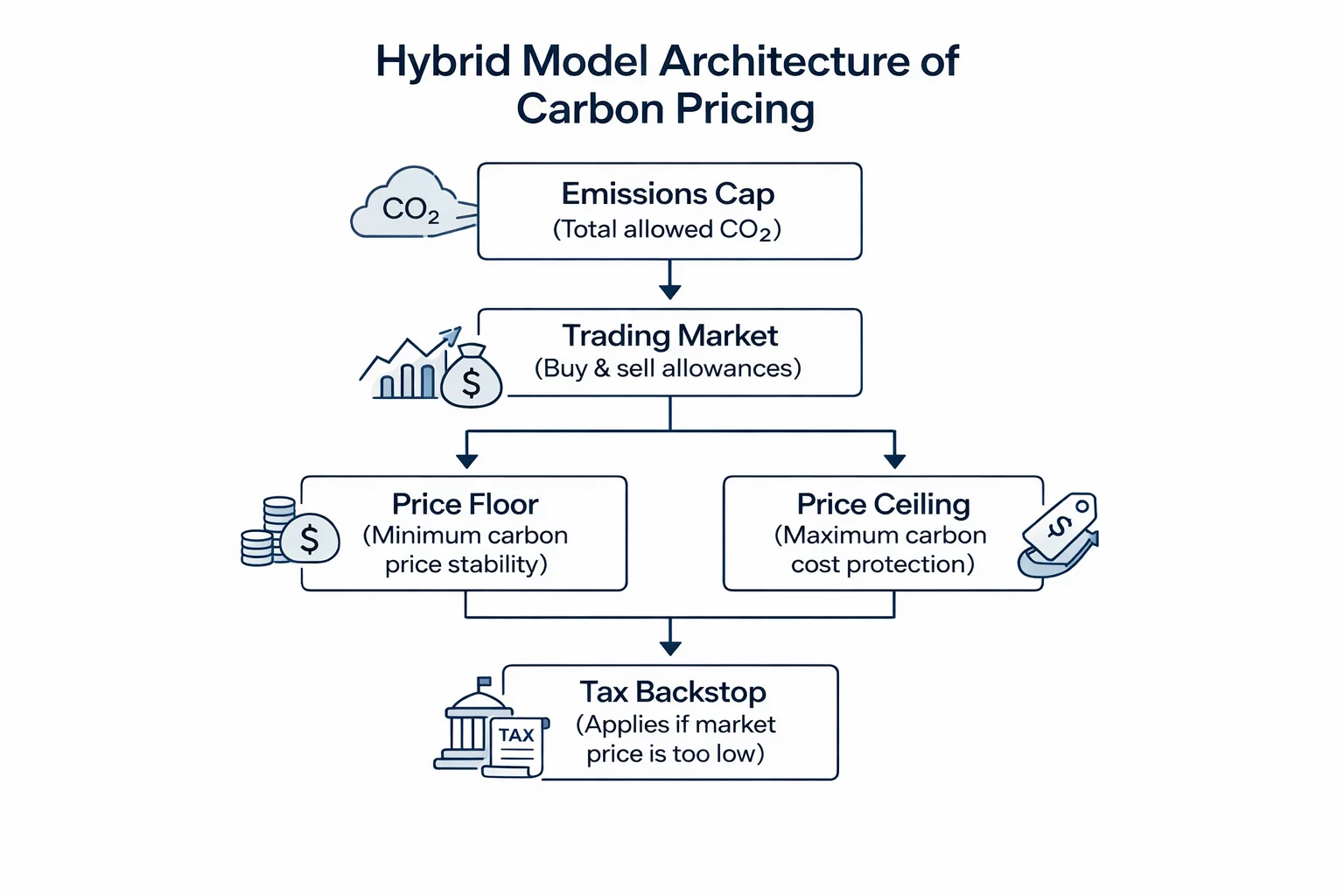Throughout this series, we examined carbon taxes and ETSs both as distinct approaches to pricing carbon and as hybrid models that blend elements of both. As explained in the “Carbon Taxes vs. Emissions Trading Schemes (ETS): What’s the Difference?” article, hybrid models represent policymakers' attempts to adapt to political constraints, economic conditions, and administrative capacity.