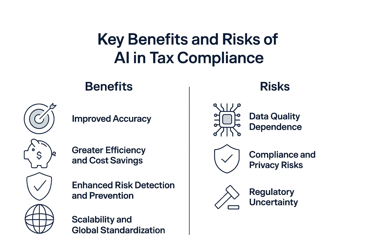 L'article précédent sur l'IA et la conformité fiscale, AI in Tax Compliance : Understanding the Stack and Use Cases, a donné un aperçu de ce que comprend la pile de la conformité fiscale et de la manière dont l'IA peut être appliquée à différents stades de la conformité fiscale. Cependant, lors de toute décision stratégique, y compris la mise en œuvre de l'IA dans la conformité fiscale, il est essentiel de prendre en compte tous les facteurs, y compris les avantages et les défis.