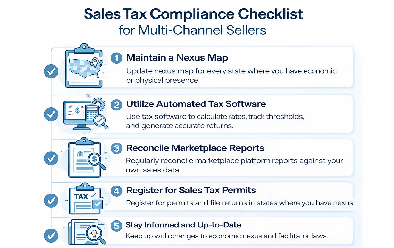 Since marketplace facilitator laws do not cover every sales scenario for multi-channel sellers, sellers should accurately distinguish between marketplace and direct-channel sales. Additionally, sellers should not ignore the impact of inventory placement on the physical nexus. Record-keeping is another frequent source of compliance failure. States may conduct audits comparing marketplace reports against seller filings.